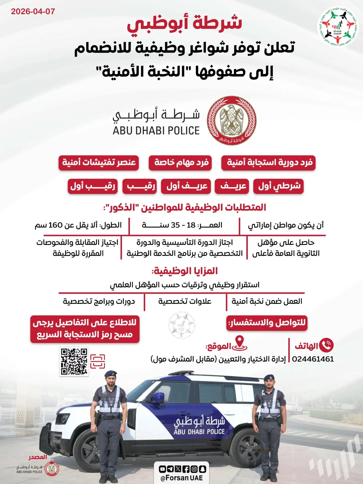 في إطار سعيها المستمر لتعزيز الكفاءات الوطنية وحفظ الأمن والاستقرار، أعلنت شرطة أبوظبي عن فتح باب التوظيف وتوفر شواغر وظيفية جديدة للمواطنين للعمل ضمن صفوف ما يُعرف بـ "النخبة الأمنية".